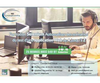 | Formation Selenium Découvrez notre Formation Automatisation Testez vos interfaces Web avec Selenium. --------------------------- Cette formation de 25 heures présente aux participants les techniques et bonnes pratiques pour organiser l`automatisation des tests des applications web avec Selenium. --------------------------- --cabinet de coaching, de consulting et de formation --12 ans d’#expérience et d’expertise dans le milieu de la #formation Professionnelle. --Plus de 20 000 heures de formation dispensées depuis sa création. --------------------------- Info et Inscription: Cliquez sur le bouton contact ci-dessus Adresse : Cité Jamil Esc "D", 1er étage, App N°2, ElMenzah6- Ariana 2091 (à côté du centre culturel Menzah6 ) |