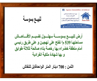 | A vendre a Sousse sahloul 4 un terrain nu de 539 m² ouvrir en deux face sur la route principale Avec un permis de construire valide pour trois étages avec titre bleau individuel Prix :700 Dt m² à discuter Tél : 27 578 908 / 53 578 908 Local de l'agence al istikrar : Galerie le Printemps Kairouan | |||||||||||||||||||