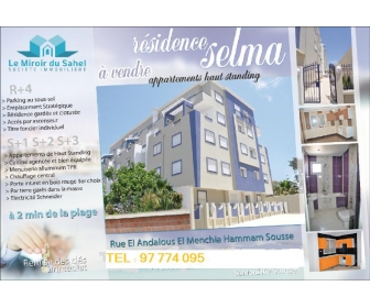| Bonjour, nous pouvons vous proposer un appartement, et trouver un arrangement. je veux bien attirer votre attention que notre résidence R+4 contient des S+3, S+2 et S+1 et des studios ainsi que des places parking. Elle se trouve dans un endroit sécurisé à coté de l'agence de police et à 2 min de la plage, prés de MONOPRIX Menchia....... Sachant Madame que notre résidence vous garantit une vie conforte avec un chauffage centrale (chaudière installée), pré installation des climatiseurs, un ascenseur, des cuisines agencées et équipées (Plaque+four+haut)... Vous êtes le bienvenue Madame Monsieur et vous pouvez nous fixer un rendez vous à la résidence pour choisir l'appartement convenable . Mon N° de portable :97 774 095 Cordialement Fehmi | |||||||||||||||||||