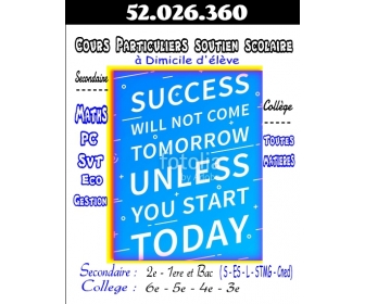 Prof Principal..30 ans expérience consistante et témoignée entre Paris - Lyon - Rabat - et Tunis Polyglotte (5 langues ).. Polyvalent.. et Formateur pédagogique, assure cours particuliers et soutiens scolaires à domicile d`élève sur grand Tunis et banlieues .. mobilité géographique et ponctualité ..pour CYCLE SECONDAIRE Classes de :: Seconde - 1ere - et Bac toutes filières :: S / ES / L / STMG en -- Maths -- PC -- SVT -- HG -- Eco.Gestion et français -- CYCLES COLLEGE Classes :: 6e - 5e - 4e - 3e Brevet en Toutes Matières ** Scientifique -- Maths -- PC - - SVT ** Matières Sociales ** et Matières littéraires Français Anglais Arabe Encadrement suivis régulier organisé Assistance permanante pour nivellement ,, assimilation ,, et mécanisme maitrise ,, approfondissement ,, anticipation.. régime particulier pour élèves aux difficulté particulières pédagogie assouplie .. motivation apprentissage à l`autonomie et prise d`initiative l`organisation et pilotage Option d`une cadence de Jour apés Jour = 4 Séances / Semaine = 16 S / mois ou quotidienne sauf Samedi et Dimanche = 20 Séances / mois étudierais toute proposition pour mise à, disponibilité totale et immédiate pour famille sourieuse |