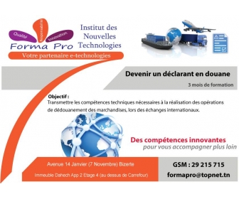 | Forma Pro pour : transmettre les compétences techniques nécessaires à la réalisation des opérations de dédouanement des marchandises, lors des échanges internationaux. Institut des nouvelles technologies avenue 7 novembre, immeuble Dahech étage 4 (au-dessus de carrefour) Tél 29 215 715 | |||||||||||||||||