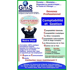 | Institut Gitas lance une nouvelle session de formation EN COMPTABILITÉ ET FISCALITÉ : Comptabilité Générale , Bilan Comptable , Comptabilité Informatisée ( CIEL , GAGE ) , Mécanisme et Gestion de la Paie , Bureautique et Internet , Français de Communication , Gestion D`entreprise . Contactez nous maintenant !!ADRESSE : 91, avenue de la liberté, le belvédère, 1002, Tunis | |||||||||||||||||