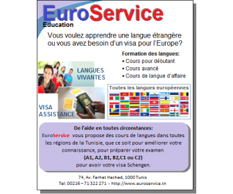 | EuroService propose des cours de langues privés dans toutes les régions de la Tunisie que ce soit pour les étudiants, les professionnels ou pour les immigrants qui veulent apprendre une langue afin de se préparer à une évaluation obligatoire, à la délivrance éventuelle du visa long séjour, visa nécessaire pour l’entrée sur le territoire Européen. EuroService assiste les demandeurs de visa ayant vocation à déposer leurs demandes au consulat général d’un pays européen à Tunis pour traiter les dossiers des demandes de visa pour les pays d’Europe, déposés par des ressortissants tunisiens et des étrangers résidents en Tunisie. Pour plus d’informations, veuillez nous contacter Par téléphone (00216) 71 322 271, ou par email : office@euroservice.tn | |||||||||||||||||