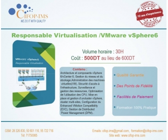 | CIFOP-IMS est une société d`ingénierie informatique et de formation professionnelle a le plaisir de vous annoncer le lancement de sa prochaine session de formation pratique en Responsable Virtualisation /VMware vSphere6