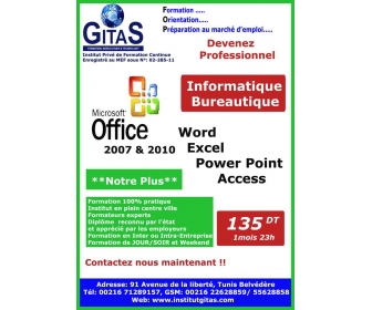 | Institut Gitas lance une nouvelle session de formation en INFORMATIQUE BUREAUTIQUE : Word, Excel, PP et Access. Notre Plus Inscription Gratuite . Formation 100% pratique . Institut en plein centre ville . Formateurs experts . Diplôme reconnu par l’état et apprécié par les employeurs . Formation en Inter ou Intra-Entreprise . Formation de JOUR/SOIR et Weekend . Contactez nous maintenant !! ADRESSE : 91, avenue de la liberté, le belvédère, 1002, Tunis . | |||||||||||||||||