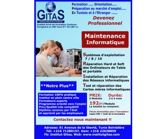 | Institut Gitas lance une formation pratique en maintenance et Réseaux Informatiques: Systèmes d’exploitation 7 / 8 / 10, Réparation Hard et Soft des Ordinateurs de Table et portable, Installation et Réparation des Réseaux informatiques, Test et réparation des Cartes mères informatiques Contactez nous maintenant !! Email: info@institutgitas.com Web: www.institutgitas.com 91, avenue de la liberté, le belvédère, 1002, Tunis | |||||||||||||||||