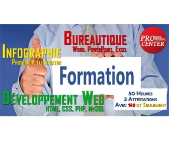 | Vous souhaitez créer vos propres sites Web professionnels ? ➦ Vous souhaitez devenir un développeur Web expert ? ➦ Vous voulez intégrer le marché du travail du développement informatique et Maîtriser les outils indispensables : Bureautique `Word , Power Point ,Excel, Infographie ( Photoshop, Illustrateur ) Développement Web (HTLM5, CSS3, JavaScript, PHP5, MySQL) ? ➦ Vous voulez vous convertir en développeur web et commencer une nouvelle carrière ? ☺ Vous êtes au bon endroit ! ============================ ☞ Dans ce Pack de formations certifiantes, vous apprendrez tous les outils nécessaire pour le développement web : HTML5, CSS3, JavaScript, PHP5,….) ============================ Pour qui ? ============================ ✰ Toute personne souhaitant se convertir et devenir un développeur web ============================ Objectifs pédagogiques ============================ À la fin de cette formation , vous saurez... ✰ Maîtriser les langages HTML5, CSS3 , PHP5 , JavaScript ✰ Maîtriser l`outils Bureautique (Word , PowerPoint ,Excel ) ✰ Maîtriser l`Adobe CS6 ( Photoshop et Illustrateur ) ✰ Créer des pages Web statique et dynamique de très haut niveau ✰ Possibilité d`intégrer des stages pratiques dans des entreprises de développement privés ============================ 3 attestations de formation sera délivrée pour chaque participant. ============================ ⌚ Volume d`horaire: ✰ 2 Mois de Formation = 50 Heures Cours du jour - Cours weekend ✰ Adresse: Av Ibn Khaldoun ,Près de la Faculté de Musique , Imm chbil Bou Dokhan ,sousse ========================== Prix de la formation : 150 DT Frais d`inscription : 10 DT ============================ Groupe réduit : Les places sont très limités (6 maximum), premier arrivé premier servi ============================ | |||||||||||||||||
