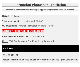 | Formation Photoshop - Initiation Durée : 21 heures 7 jours par semaine : Lundi -- Jeudi (3h par jour) Ou 2 weekends : vendredi - samedi et dimanche (4h par jour) Laptop - Pc portable: Obligatoire Installation Photoshop CS6 ou CC : Gratuite Prix : 50dt Seulement - Certificat fin de la formation Programme : Module 1 – Notions de l’image Module 2 – L’interface de Photoshop Module 3 – Les calques Module 4 – Les images Module 5 – Le détourage Module 6 – Les filtres Module 7 – Optimisation et enregistrement | |||||||||||||||||