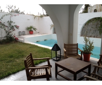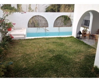 A louer pour toute l`année chez l`agence TPS IMMOBILIERE Hammamet, une belle villa avec piscine située dans un quartier calme, à 10 minutes du centre ville et des plages, et 5 minutes de l`autoroute Tunis/Sousse. Villa de style mauresque tout en toits voûtés et arcades, 220m² bâtie sur un terrain de 350m² ; composée au RDC : 1 suite parentale avec salle d`eau (douche), 2 chambres, salle d`eau avec douche, salon/salle à manger avec une cheminée, cuisine, terrasse. Au 1er étage : 1 chambre avec salle d`eau, belle terrasse. Entièrement climatisée et équipée en chauffage central, alarme de sécurité... Meublée avec raffinement!!